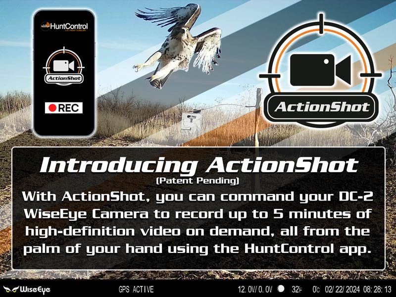 The feature that puts you in the driver’s seat for capturing those adrenaline-pumping moments in the wild. With ActionShot, you can command your DC-2 WiseEye Camera to record up to 5 minutes of high-definition video on demand, all from the palm of your hand with the HuntControl app. – Patent Pending